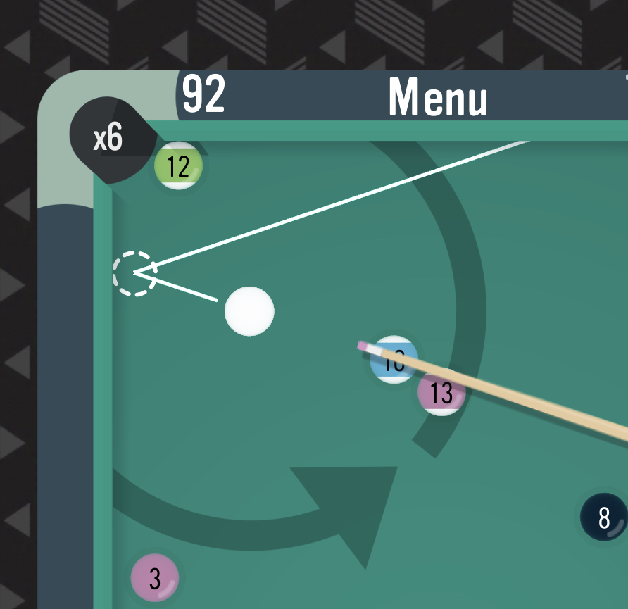 The game also has a generosity with its UI elements. When you rotate the cue stick to aim, a large set of circular arrows appear to let you know which direction you are rotating in (which can be surprisingly challenging to remember on a phone). And when you do line it up, there’s a literal line that extends from the cue ball, to where it’s going to end up. It’s easy to imagine how this game could have withheld that information to “reward skilled players”, but the game is still suitably challenging, and the extra help made me feel secure.